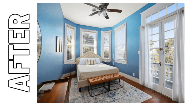 This 2nd Floor bedroom was another long, skinny room that had the furniture laid out in all the wrong ways. By tucking a Queen Size bed into the bay window with two small nightstands (rather than having the bed on the long wall across from the french doors) it made this feel SO MUCH more spacious. This room gets a ton of light so I chose a bold blue for the walls (SW 7609 Georgian Revival Blue). Putting two small leather ottomans at the end of the bed provided seating for putting on your shoes or getting dressed. We also upgraded the window coverings to 2″ blinds and put room darkening curtains on the french doors. This is my go-to room when we stay at the beach because it feels so magical with the beautiful blue walls and natural daylight. It’s also right off The Library Room where our twins sleep, so we’re close enough if someone needs us in the middle of the night – but still behind closed doors so we don’t disturb them while they’re sleeping.