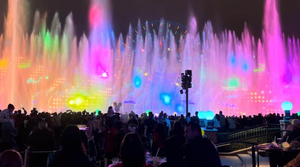 For World of Color, we booked the Dessert Party tickets. This was EXPENSIVE but many folks recommended so I booked it at $80 per person. What you get is a massive dessert tray for each person and (2) alcoholic drinks per adult plus unlimited coffee, hot chocolate, and soft drinks. You get a table with chairs in a reserved center area for the World of Color show – think of it as the Bellagio fountain, but Disney with songs and movies projected on the water. It was honestly really cool to see we didn’t need to spend so much money on the seating and dessert. I would recommend watching from the bridge or claiming a floor seat about an hour before the show. If you sit in the front directly by the water, you will get wet!